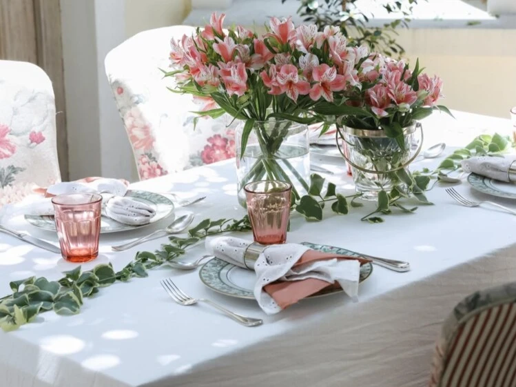 La vajilla botánica suma romanticismo sin caer en lo infantil. Motivos florales, líneas finas y tonos pasteles conviven con cristalería transparente y cubiertos simples, que evitan la saturación visual.