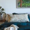 Almohadón de lienzo con tapa de adelante pintado a mano en petróleo y dorado y tapa de atrás lisa.