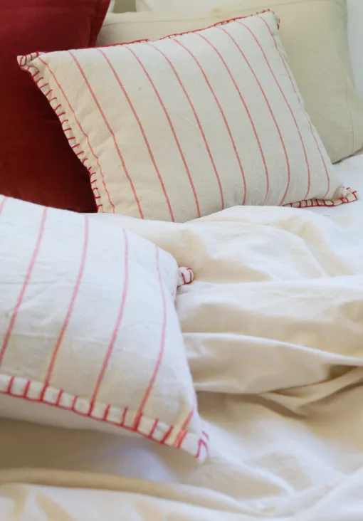 Almohadón de panamá con rayas finas rojas, con delicada terminación en crochet en los bordes.