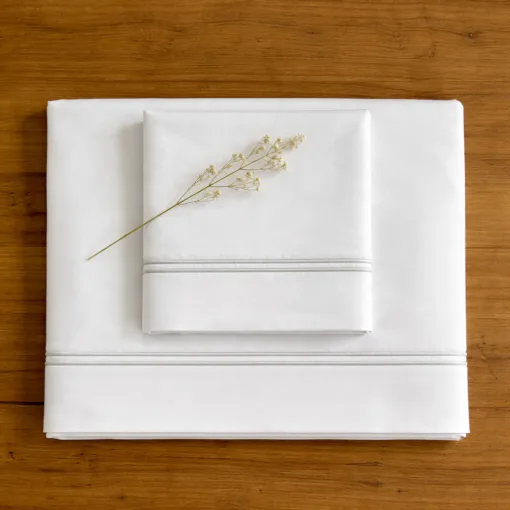 Juego de sábanas de percal blanco de 250 hilos, mezcla íntima 60% algodón peinado y 40% poliéster.
