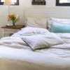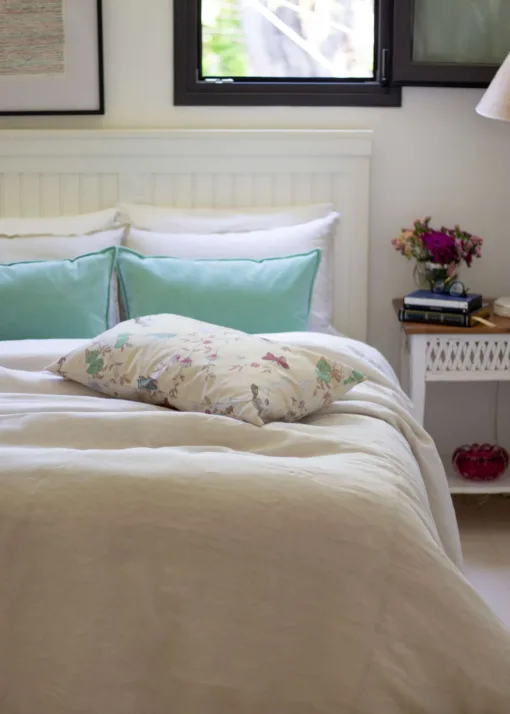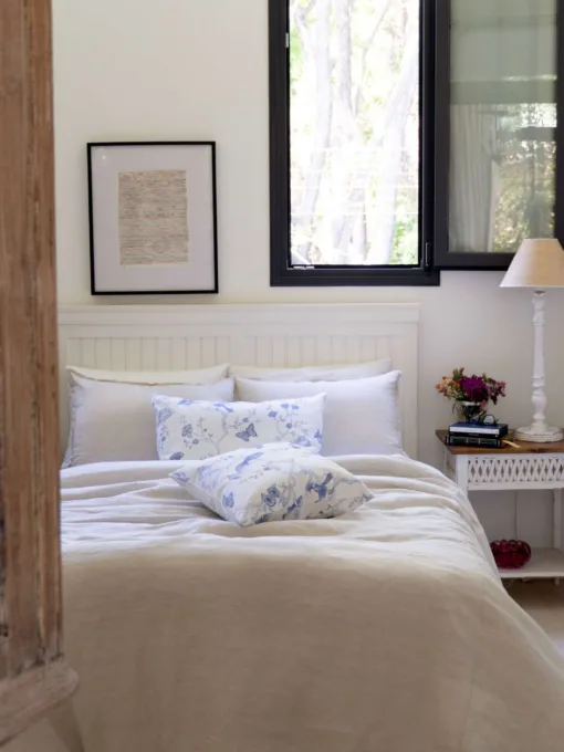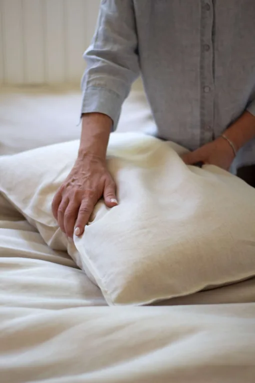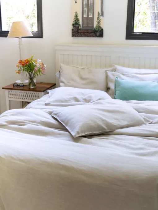 Viene con una funda de almohada de lino francés piedra con embozo en la versión de una plaza y dos fundas de almohadas en las versiones matrimoniales.