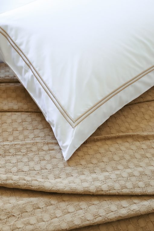 El detalle de doble festón aporta un acabado delicado y atemporal, elevando la presencia de la cama con un gesto sutil y elegante.