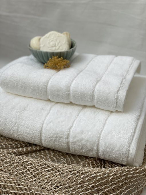 Juego de toalla y toallón de 700gr/m2, importado, con guarda, pelo largo.