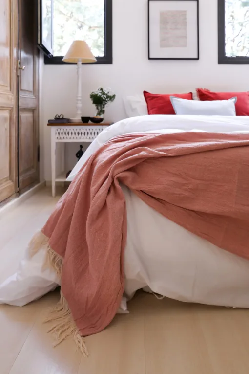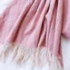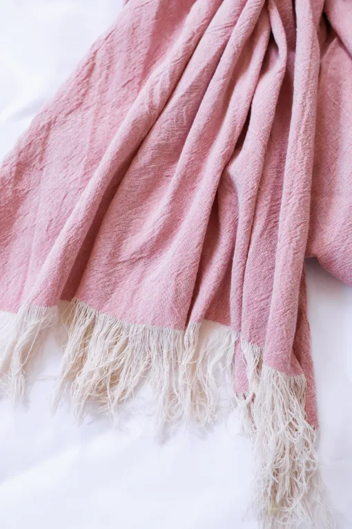 Manta de tela Panamá lavado, con flecos color magenta.
