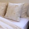 Almohadón de lienzo con tapa de adelante pintado a mano en tonos beige y tapa de atrás lisa.
