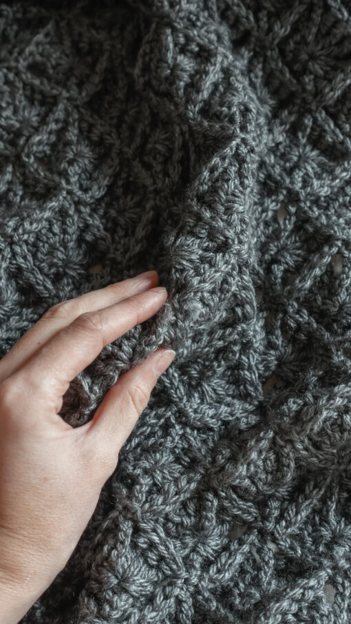 Pie de cama de lana (suave al tacto), tejido a crochet, color gris. Medidas 0,80×1,80. Lindo para la cama, para un sofá o como chal.