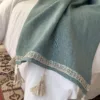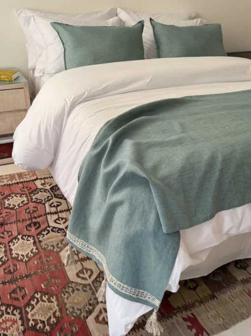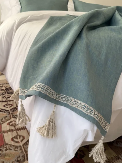 Pie de Cama de Lino tornasolado verde, con borlas .