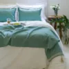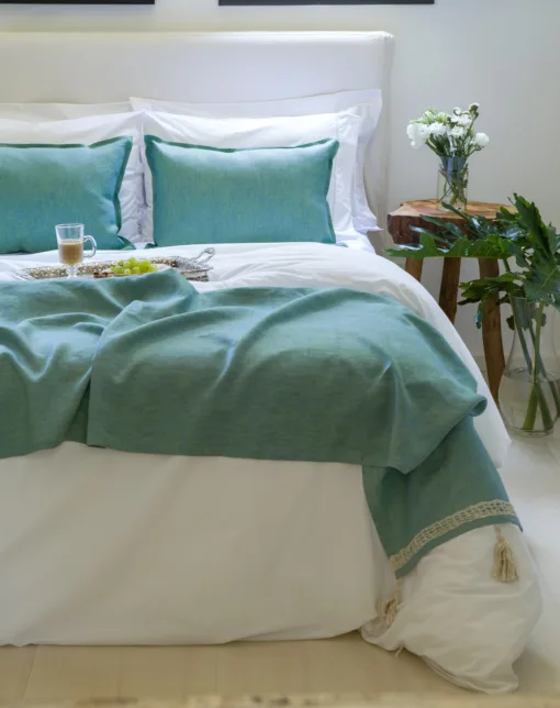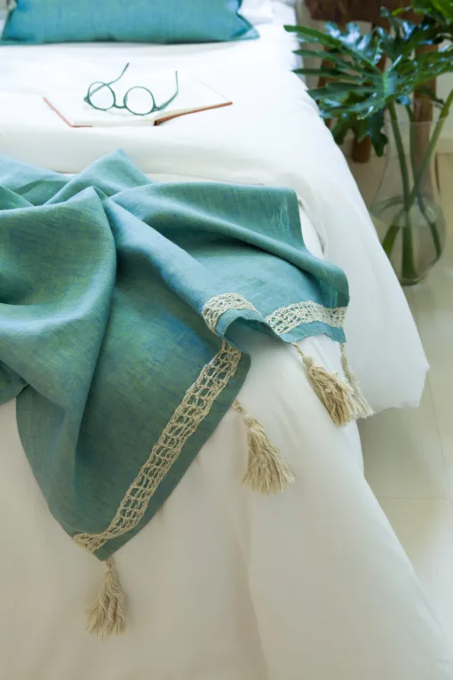 Pie de Cama de Lino tornasolado verde, con borlas .