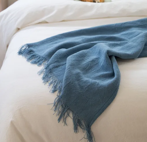 Pie de cama red celeste con flecos.