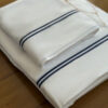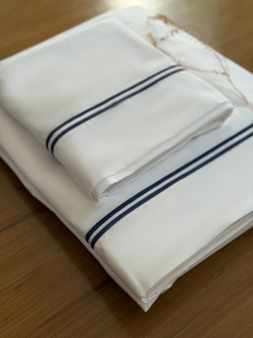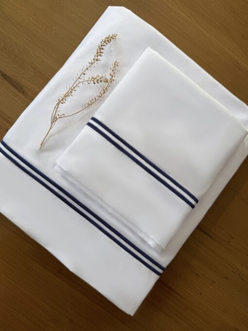 Terminación: doble festón artesanal azul marino en sábana y fundas.