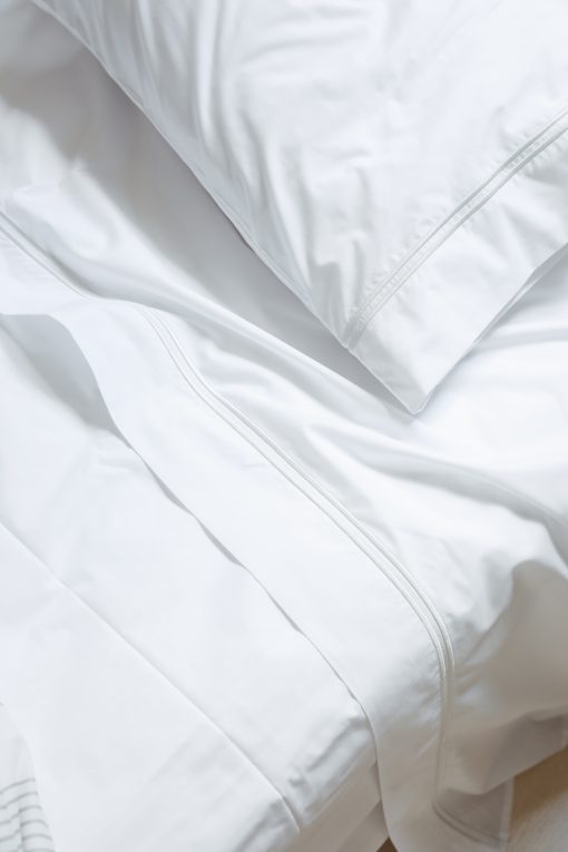 Juego de sábanas de percal blanco, 250 hilos, mezcla íntima 60% algodón peinado, 40% poliéster.